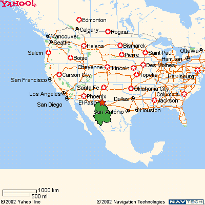 In this map you can see, in green, the mexican state of Chihuahua. Also you can see how to get to El Paso, Texas, neighbor city of Ciudad Juárez. Now you can go to the previous map and see how you can go to Cabañas de la Abuela. |